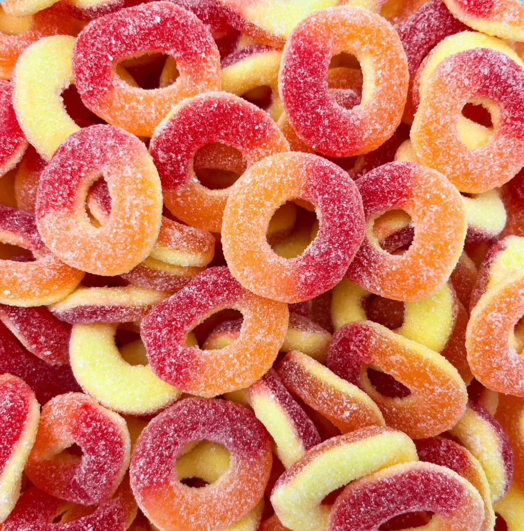 Ingrédients : Sirop de glucose, sucre, eau, gélatine de bœuf, amidon modifié de pomme de terre, acidifiants : E330, E270, arômes, agent d'enrobage : cire de carnauba, colorants : E100, E163, E160a, E129. Sans Gluten