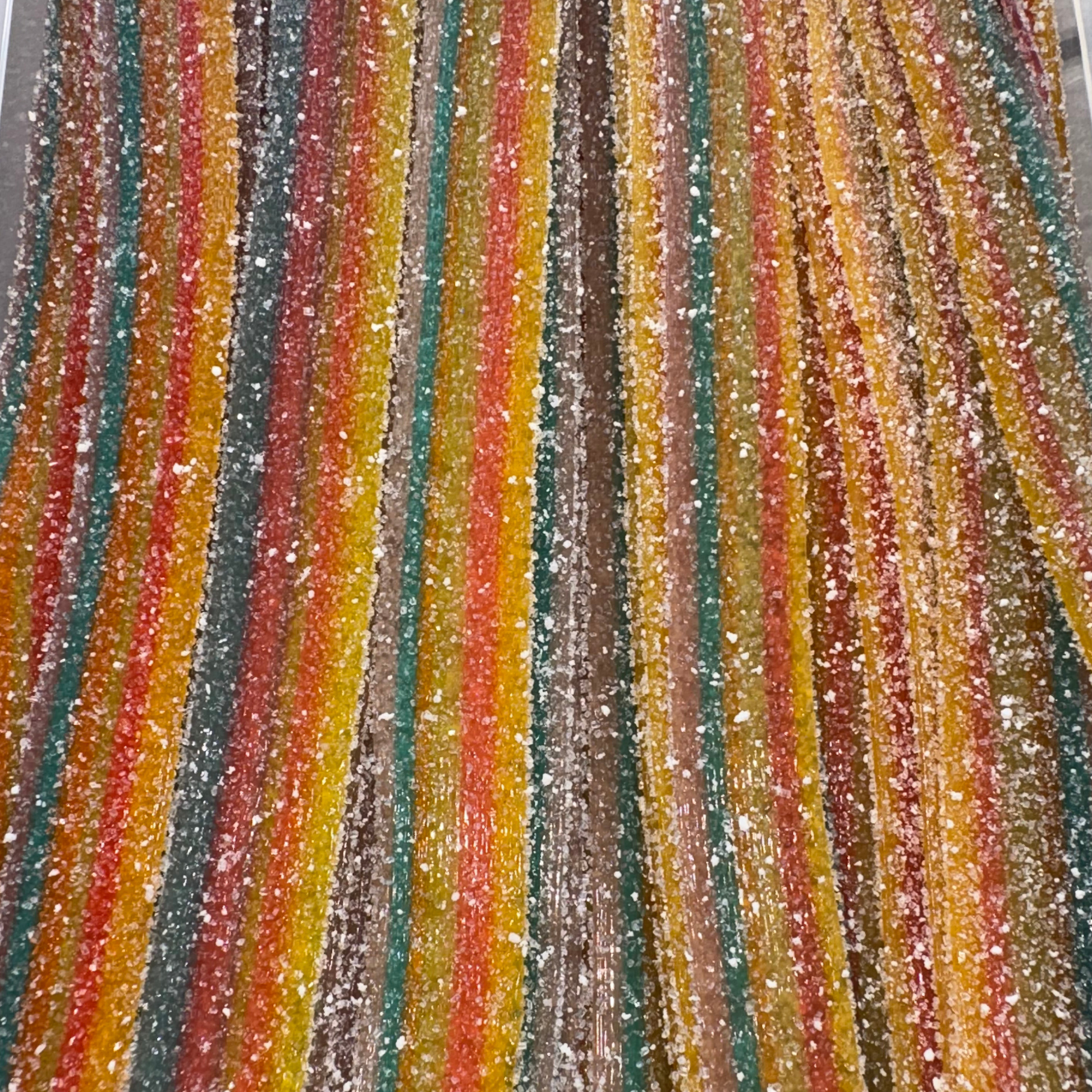 Ingrédients : Sirop de glucose-Fructose, sucre, amidon, sirop de sucre inverti, farine de blé, eau, acidifiants E330, E296, maltodextrine, correcteur d'acidité E-332, graisse vegétale (palme), arome artificiel, agent d'enrobage : cire de carnauba, émulsifiant E-322, colorants E102, E129, E133, E110. Contient du GLUTEN.