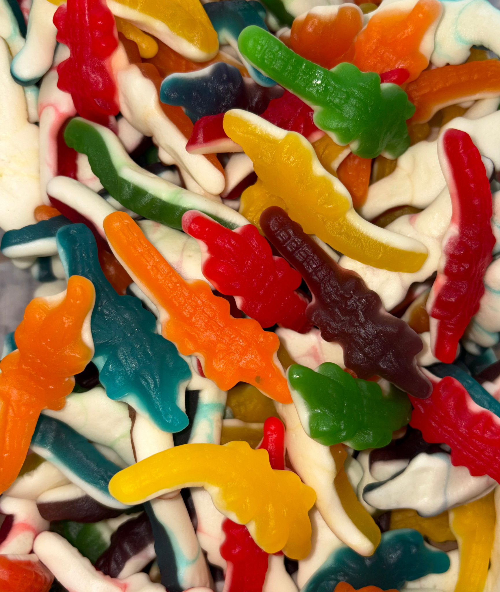 Ingrédients : Sirop de glucose, sucre, eau, gélatine de bœuf, amidon modifié de pomme de terre, acidifiants : E270, E330, agent d'enrobage : huile végétale (palme et coco) E901, E903, pectine, arômes, colorants : E129, E100, E133. Sans Gluten.