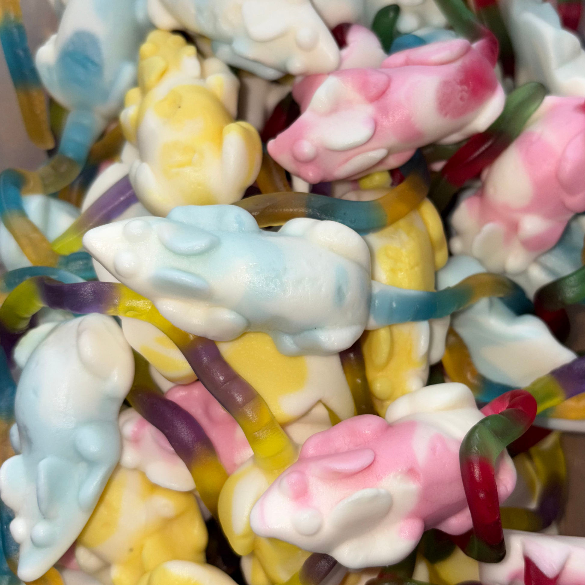 Ingrédients : Sirop de glucose, sucre, gélatine, acidifiant : acide citrique, acide lactique,stabilisant : sorbitol, gélifiant : pectine, arômes, colorants : concentré de fruits et préparation d'extraits végétal (paprika), carmin, bleu patenté V, huile végétale, agent d'enrobage, cire d'abeille, cire de carnauba.
