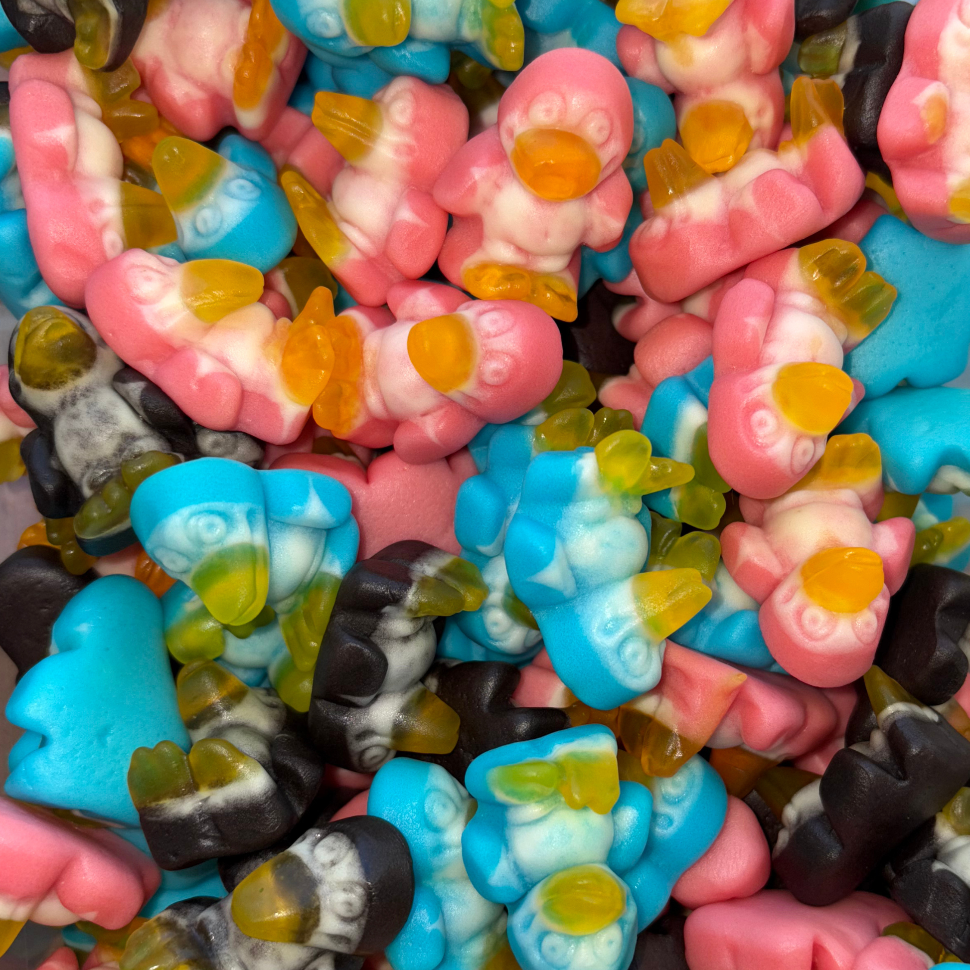 Ingrédients : Sirop de glucose, sucre, gélatine, acidifiants : acide citrique, acide lactique, gélifiant : pectine, arômes, colorants alimentaires (curcuma, paprika), colorants : carmin, charbon végétal, bleu brillant FCF, huiles végétales (coco / graine de palme), agents d'enrobage : cire d'abeille blanc et jaune, cire de carnauba.