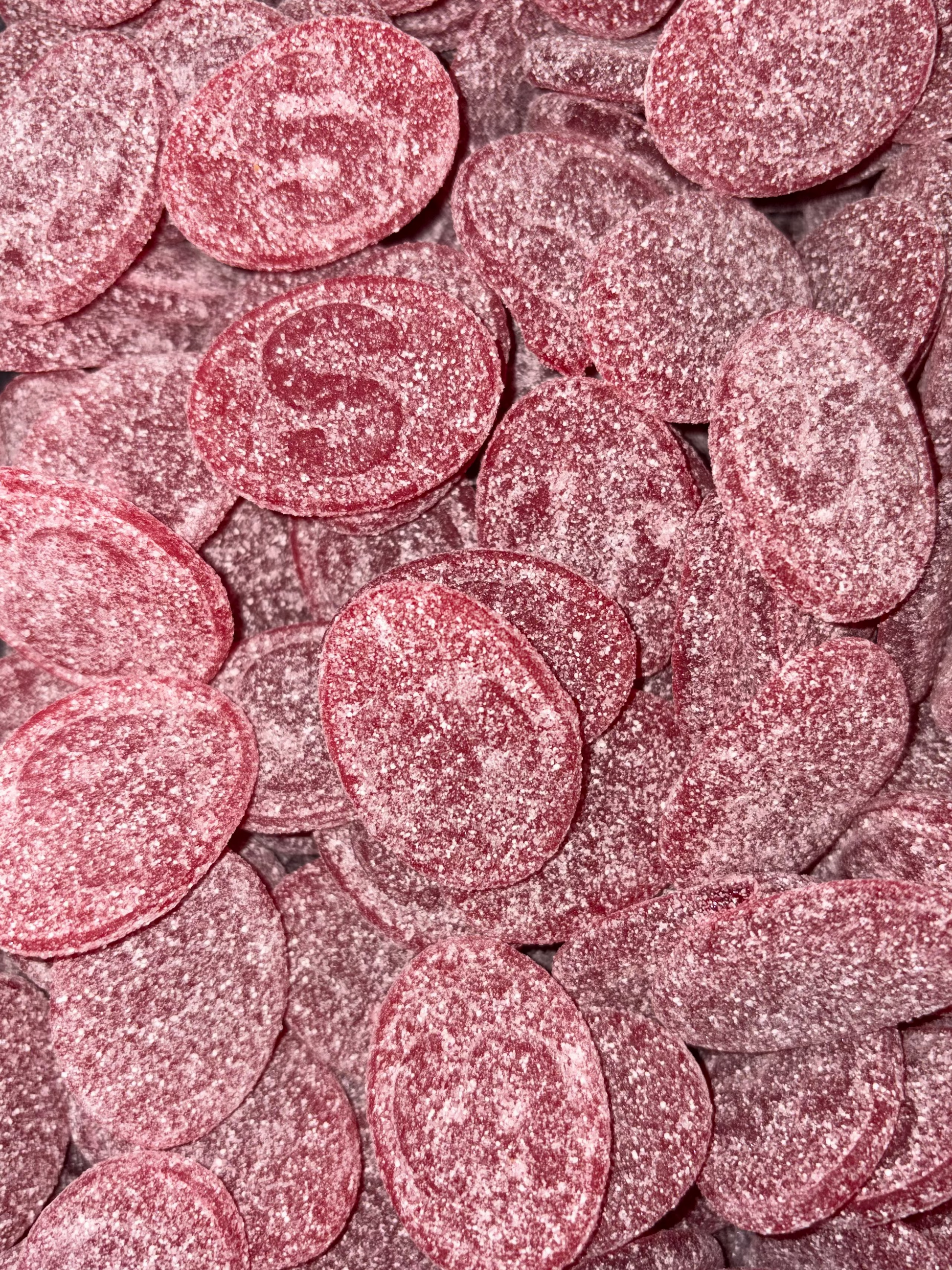 Ingrédients : sirop de glucose, sucre, amidon de maïs, acides (E330, E296), régulateurs d'acidité (malates de sodium, citrates de sodium), colorant alimentaire : concentré de cassis et carotte, arôme naturel, amidon de BLÉ.